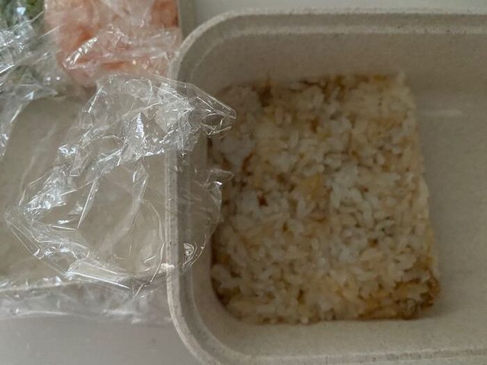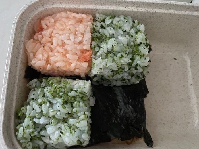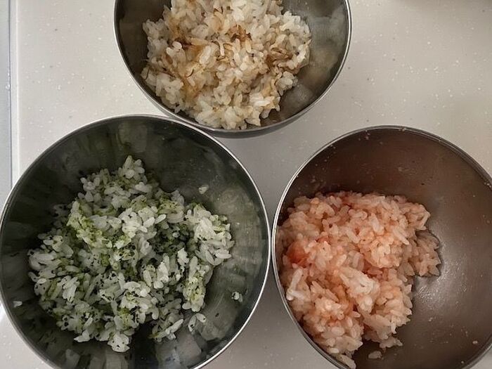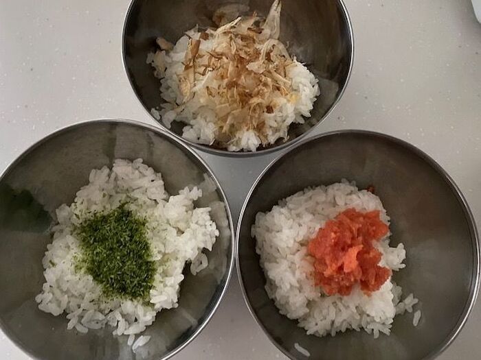 ご飯は90gと45g 45gの3つに分けて 90gにはおかかと醤油 45gには