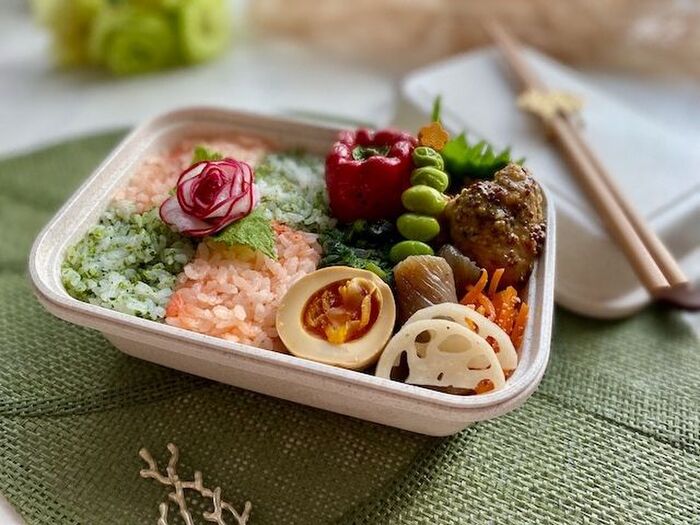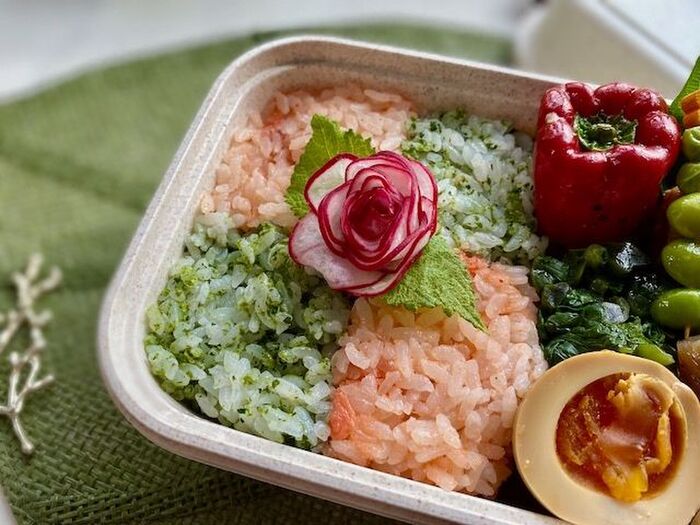 その上に 半分にした明太子と青のりご飯を市松模様に詰める