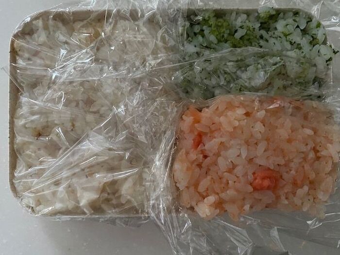 ラップを敷いて 半分におかかご飯 残ったスペースに 明太子と青のりご飯をきっちり