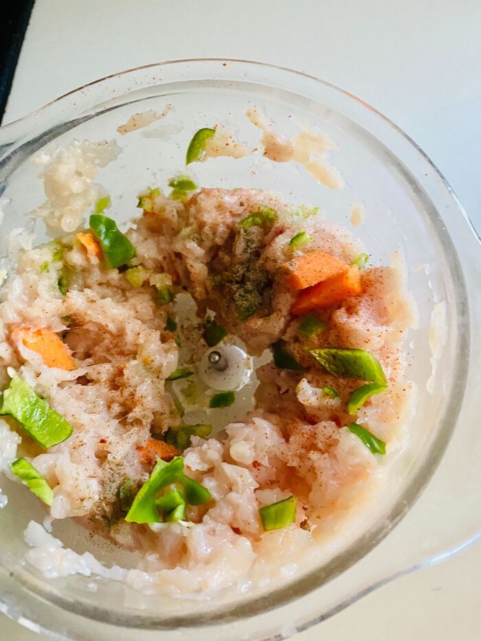 人参、玉ねぎ、ピーマンを入れミンチします。