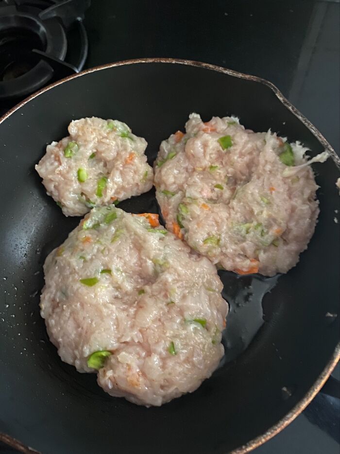生姜、塩胡椒して、お好みの大きさにまとめ、真ん中を窪ませます。
