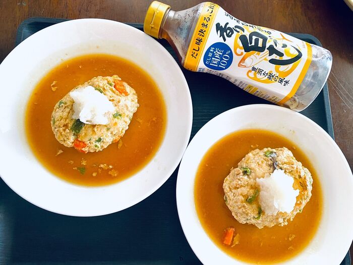 白だしにオイスターソースを合わせ、水と片栗粉を入れて混ぜ、一煮立ちさせます。焼き上がった鶏胸肉のミンチハンバーグにかけます。