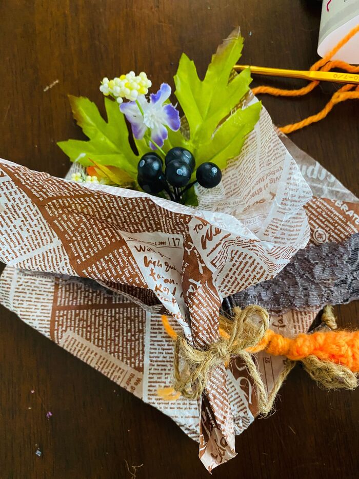 ④葡萄の造花を包装紙で包み、麻紐でリボン結びします。