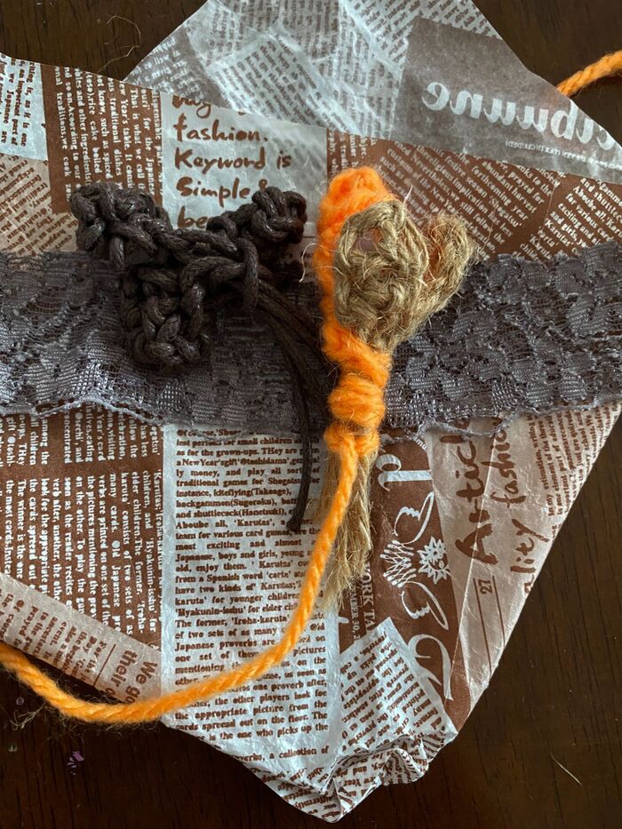 ワックスコード、麻紐も木の実のように膨らみがあるように編みます。