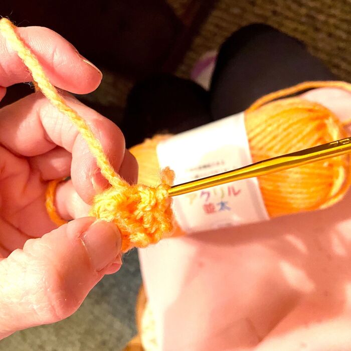 ②毛糸で、木の実のように膨らみがあるよに編みます。