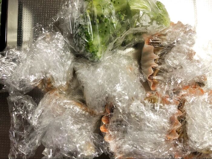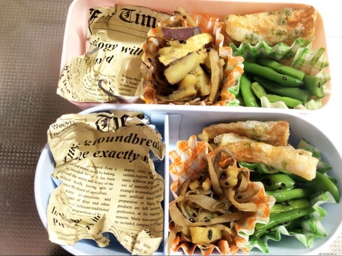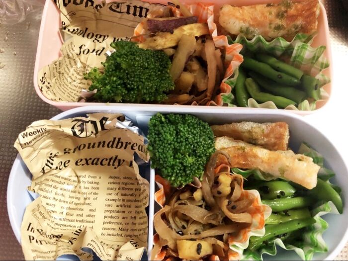 こちらは事前に作って冷凍しておいたブロッコリー、さつまいもとごぼうのきんぴら、ちくわの磯辺揚げです。