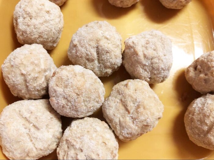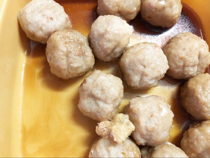 肉団子に冷凍すりおろし生姜、醤油大さじ1、オリゴ糖大さじ1で味をつけます。