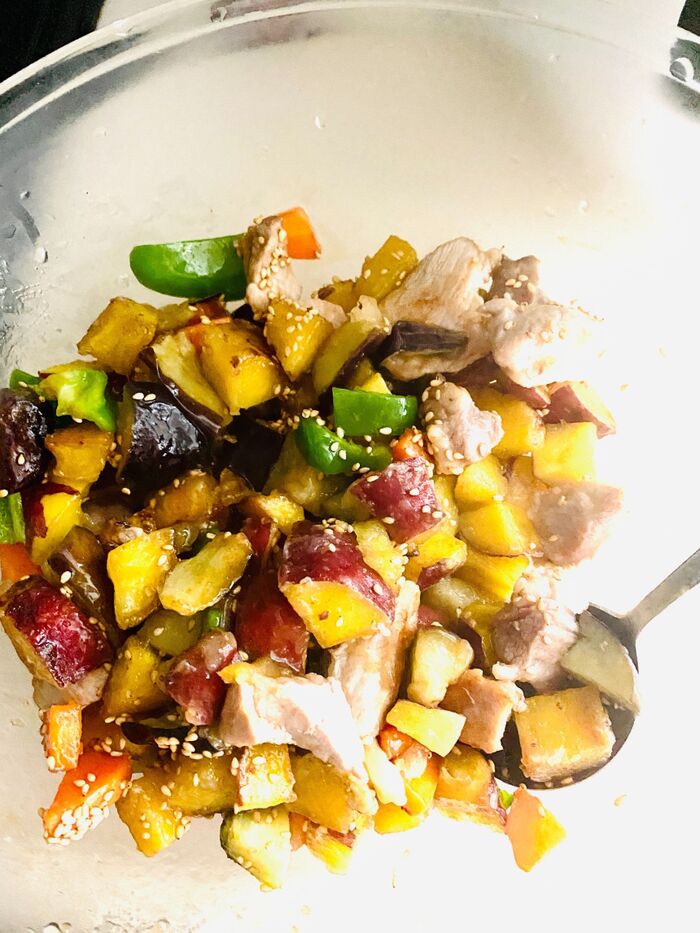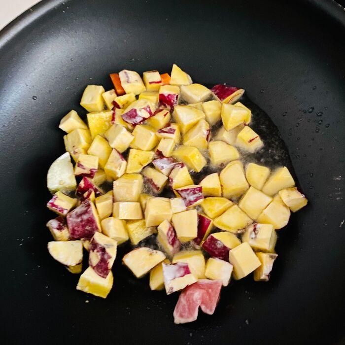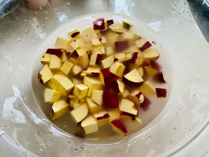 ①さつまいもは賽の目に切り、水に浸して水気を切っておいて下さい。