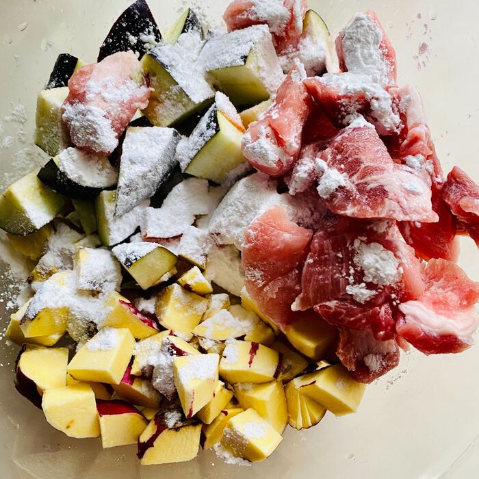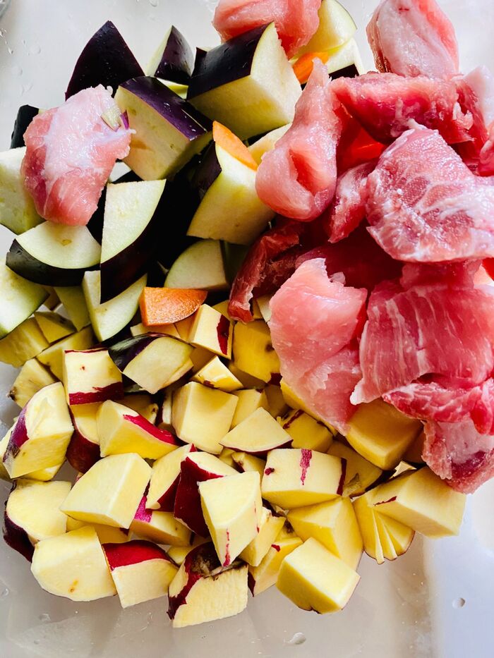 人参は少し薄めのイチョウ切りにし、豚肉は少し大きめの角切りにします。