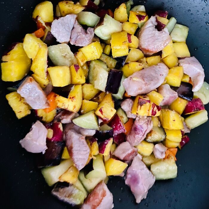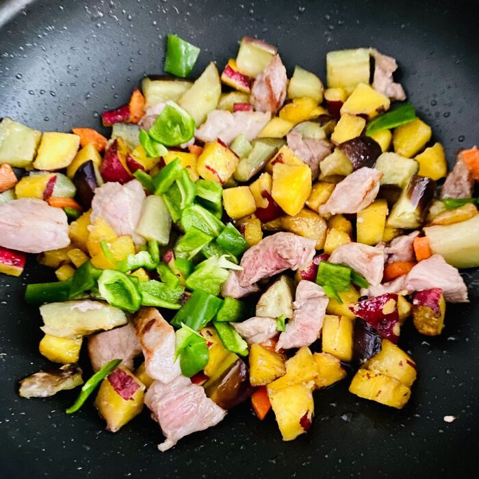 一つのフライパンで、加熱に時間がかかるものから入れて仕上げました。こうすることで、食感が統一されて食べやすく、美味しさUPしますよ。
