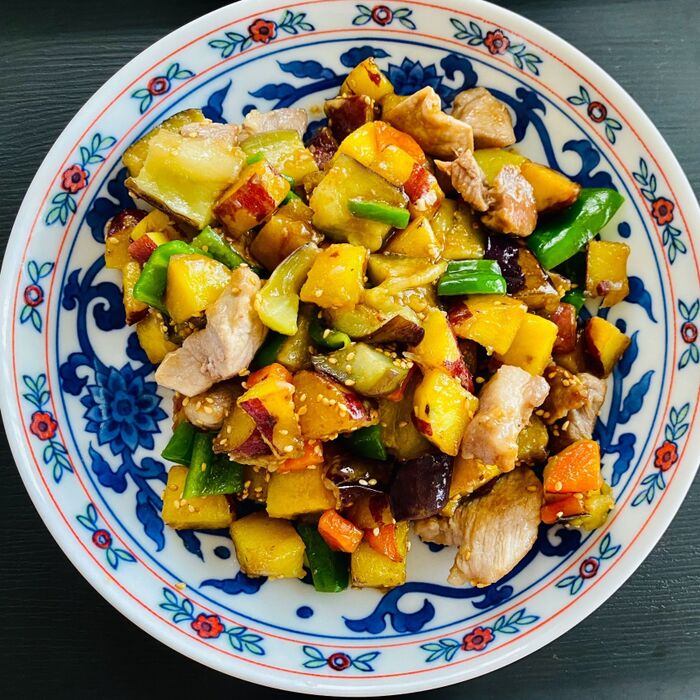 ⑤次に豚肉、ナス、人参を入れ炒めます。
