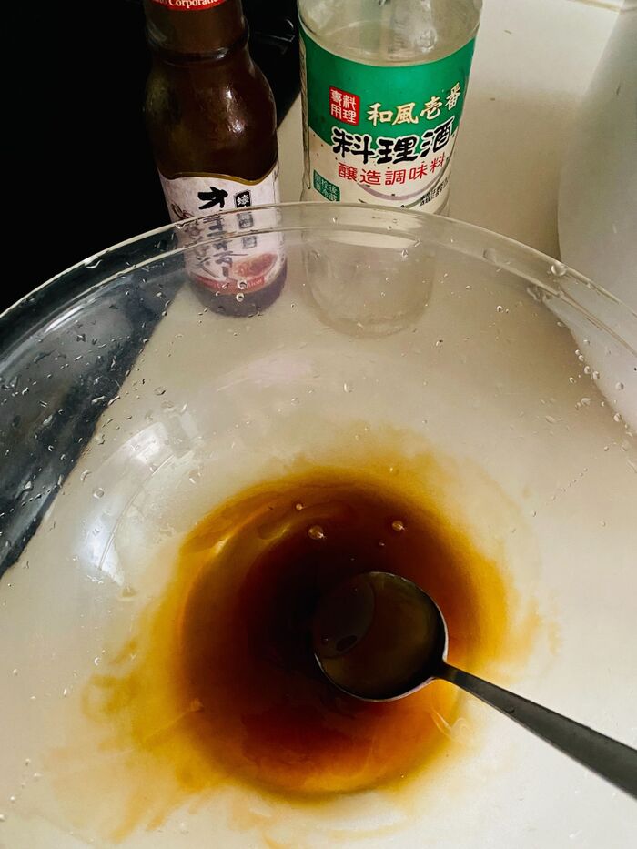 ⑦予めボールにオイスターソース、酒を入れて混ぜておきます。