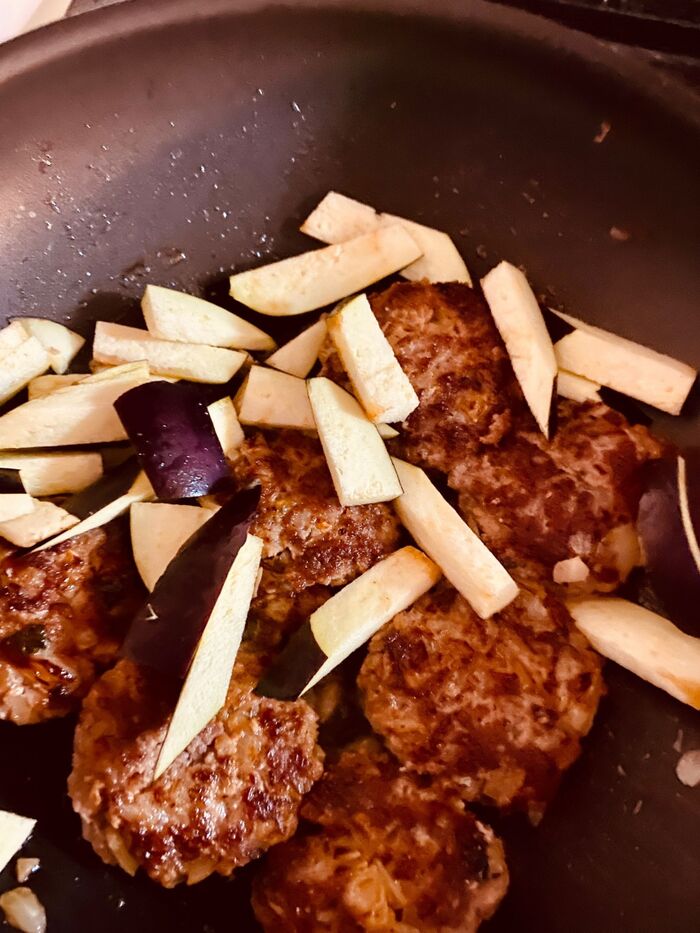 ④ハンバーグに火が通ったら、茄子を短冊切りにし、
