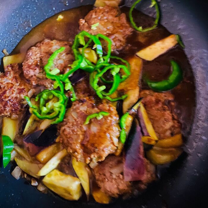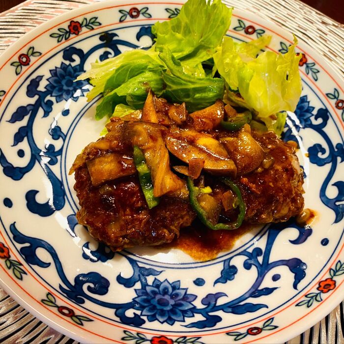 ハンバーグソースにトマトが妥当かと思いきや、秋茄子も良く合いますよ。