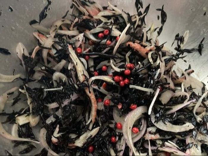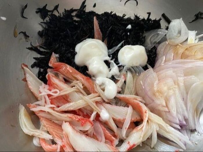 缶詰のひじき スライスした玉ねぎ ほぐしたカニカマを入れ aを加える
