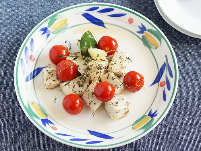 フレッシュなトマトと、ハーブが香るカジキとトマトの香草焼き。芳醇な香りが食欲をそそります。メインの食材のカジキは、タンパク質が豊富で脂肪が少なく食べ応えがあるのが特徴。血液サラサラ成分のEPA・DHAが豊富に含まれており、血中コレステロールを下げたり免疫力をサポートする作用があります。