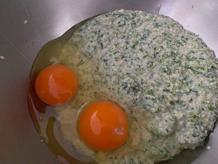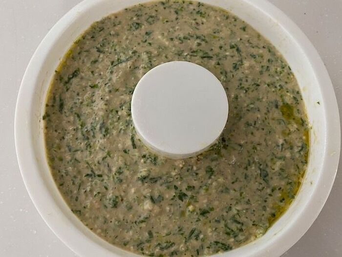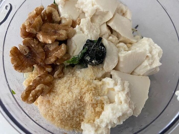 炒めた野菜 しっかり水気をきった豆腐 くるみ パルミジャーノも加えピュレ状にする
