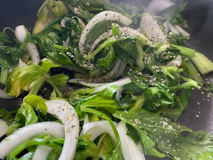 フライパンにオリーブオイルを入れ ざく切りにしたセロリの葉っぱ