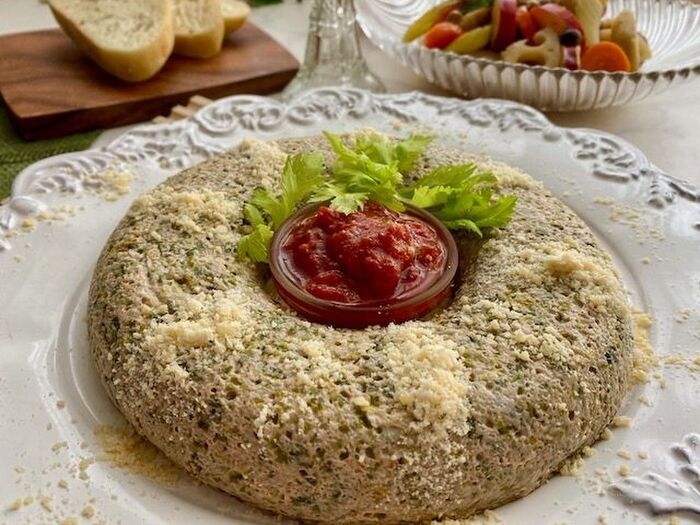 粗熱がとれたら型から外し 真ん中にトマトソースをのせ 残しておいた