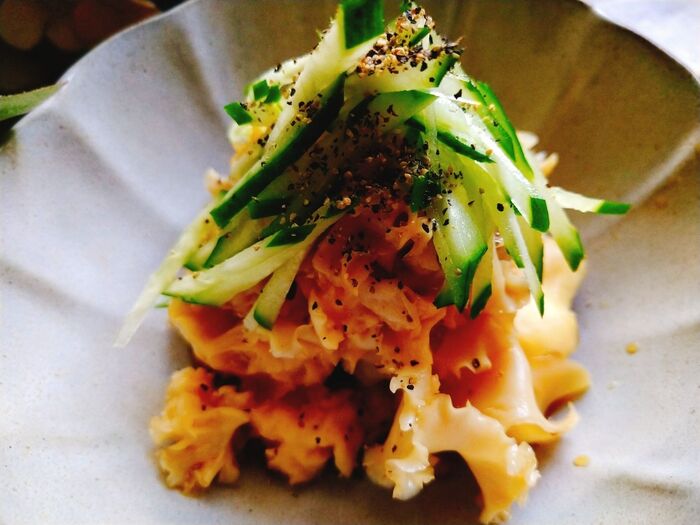 4.皿に盛りつけきゅうりをのせ、ブラックペッパーをふって完成