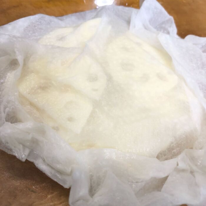 梨は皮をむいてくし切りにし、それを横に薄くスライスする。れんこんは皮をむいて薄い半月切りにし、濡らしたキッチンペーパーで包んで600W約1分半加熱する。