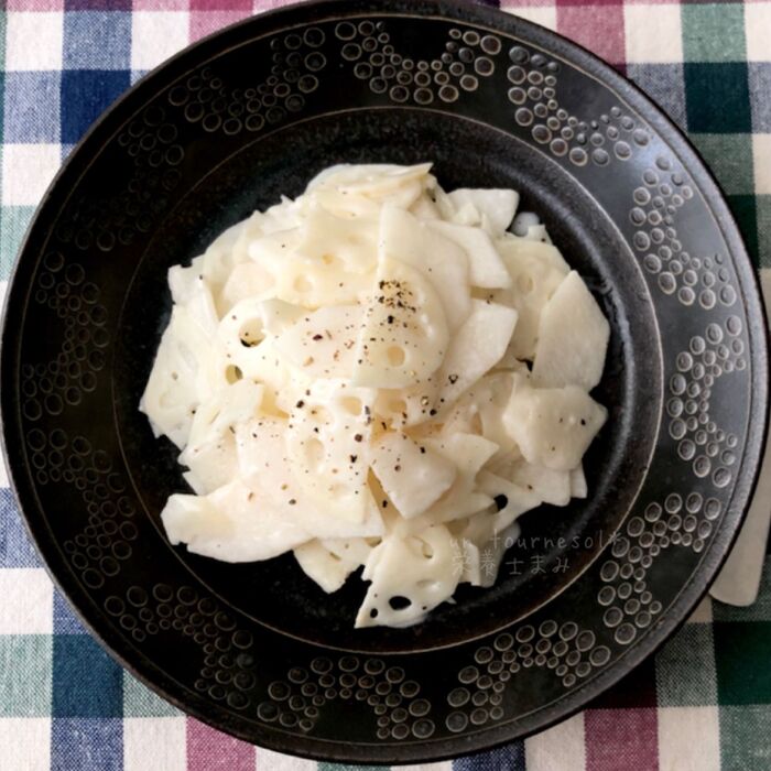 れんこんが冷めたら水気を絞り、梨とマヨネーズ・はちみつ・レモン汁・塩・ブラックペッパーをよく混ぜ合わせれば完成‼︎