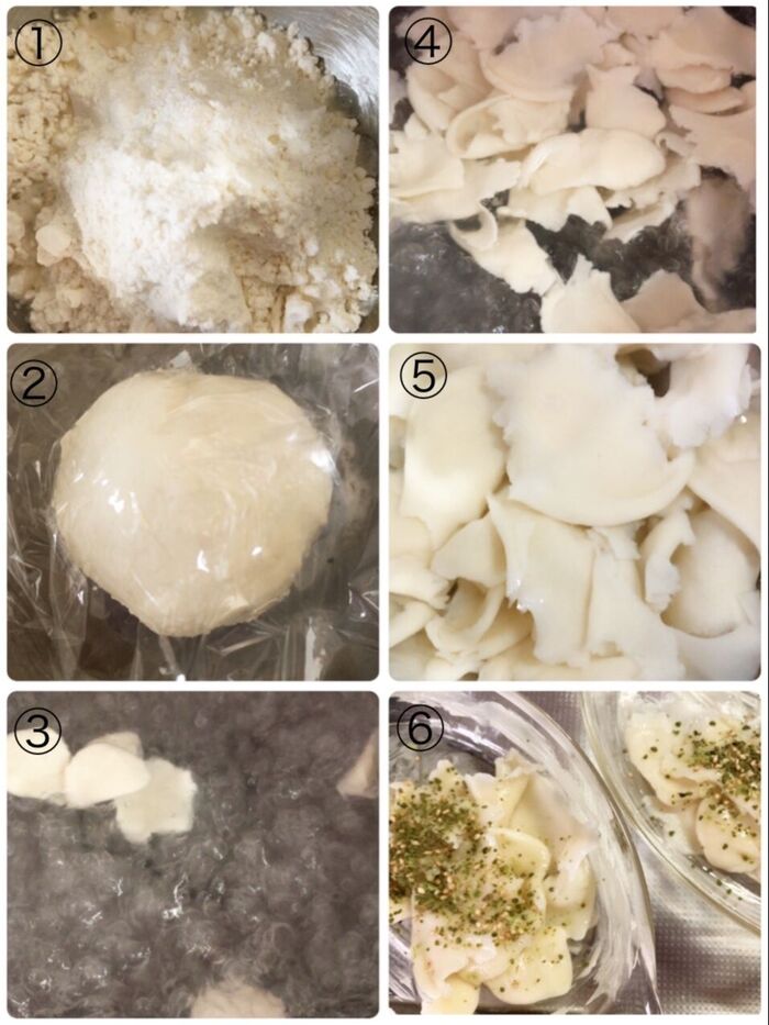 薄力粉に少しずつ食塩水を加え、耳たぶ位の固さまでこね、1時間休ませます