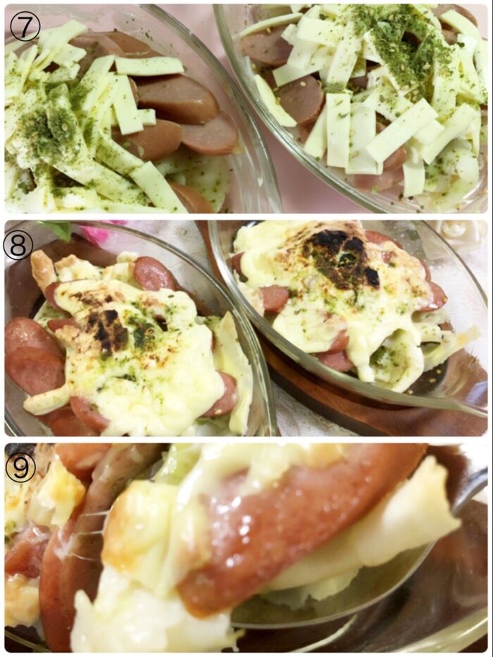 耐熱容器に水気を切ったはっととクレイジーバジルを重ね、ウインナー、チーズを乗せ上にクレイジーバジルを振ります