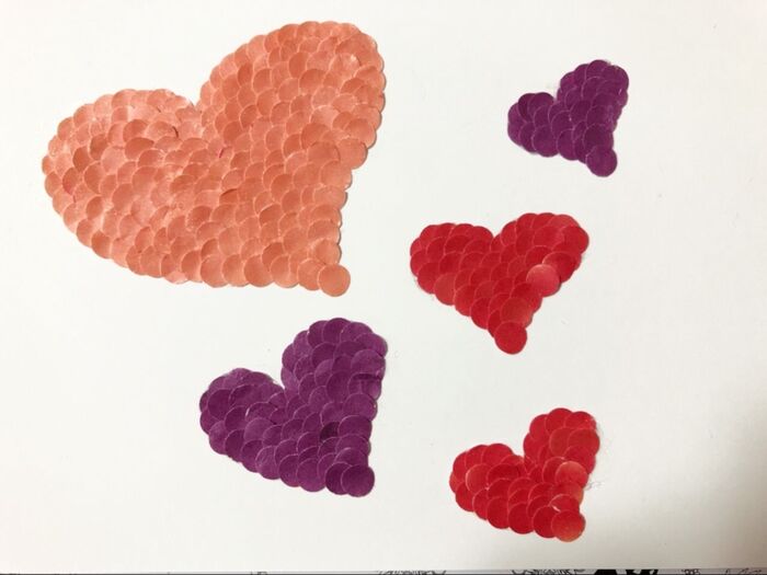 ピンク、紫、赤の包装紙を使ってそれぞれハート型にしました