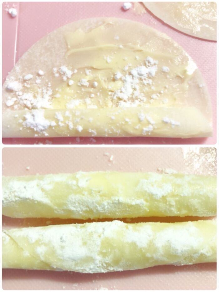 まな板に餃子の皮を並べ、マーガリンを塗り粉糖をパラパラ振ります。