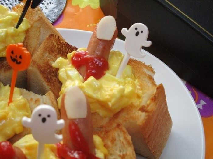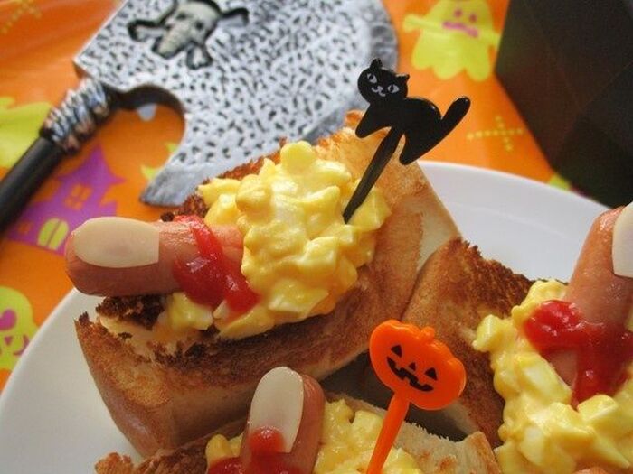 3:ウィンナーをこんがり焼いて指に見立て、ハロウィン風に飾るようにのせて、ケチャップをグロテスクにかけて完成です♪⇒⇒指に見立てたウィンナーはよく焼き、爪の付け根になる部分にナイフで切り込みを入れる、マヨネーズを塗った爪に見立てたスライスアーモンドを貼る