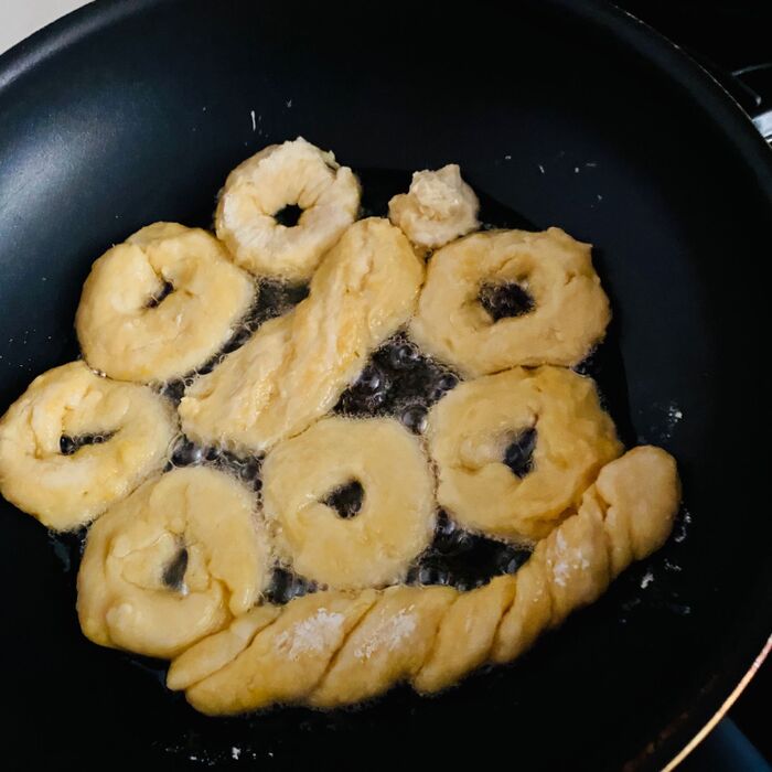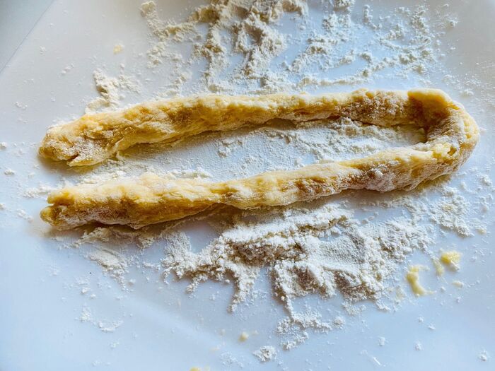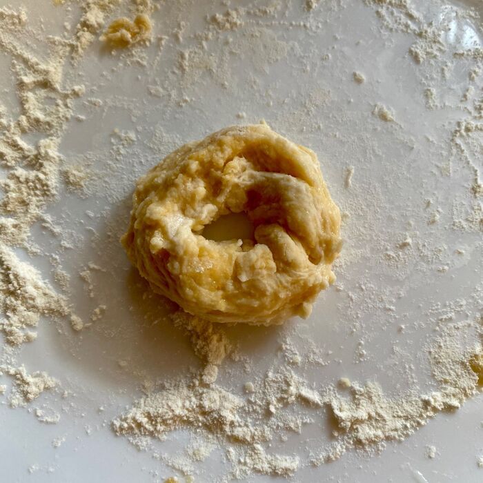 まな板に打ち粉を引いて、細長くしてから、丸く空洞を作って成形します。