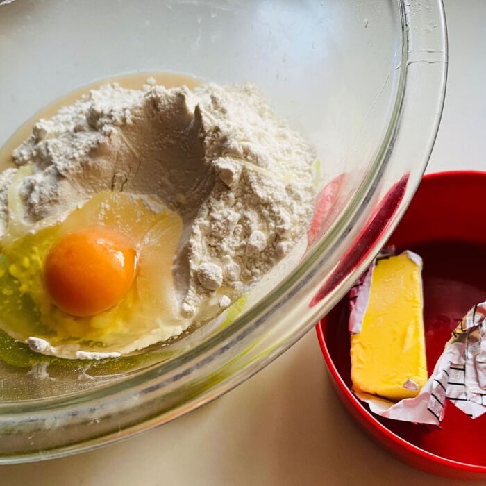 ボウルに、薄力粉,、ベーキングパウダー、砂糖、溶かしバターを入れて混ぜます。
