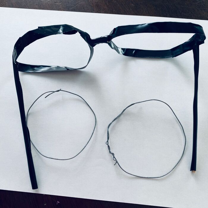 メガネを抑える部分と、かけるところは竹串に黒のビニールテープを貼って