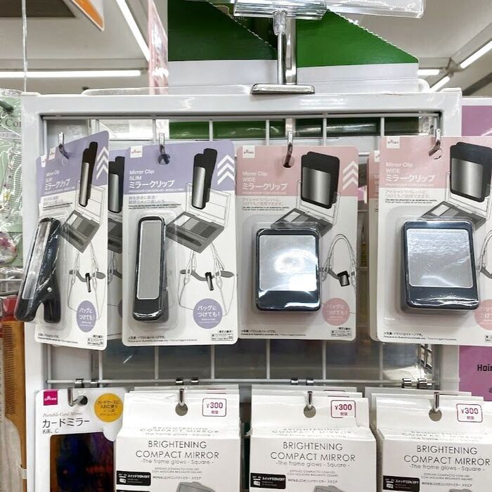サイズ的に顔全体をうつすことはできませんが,ポイントメイクを確認したりするのには,挟んで立てられるところが使いやすいです。110円なので,1つあると便利ですよ。