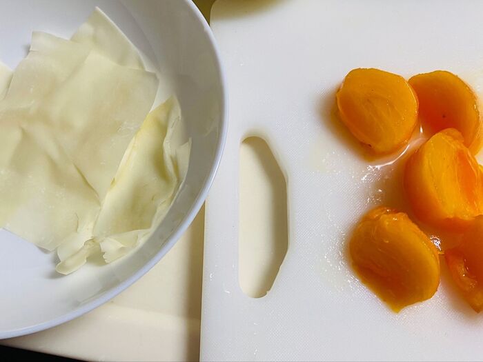餃子の皮は少し亀裂の入ったもの、柿も熟れている側を使いました。