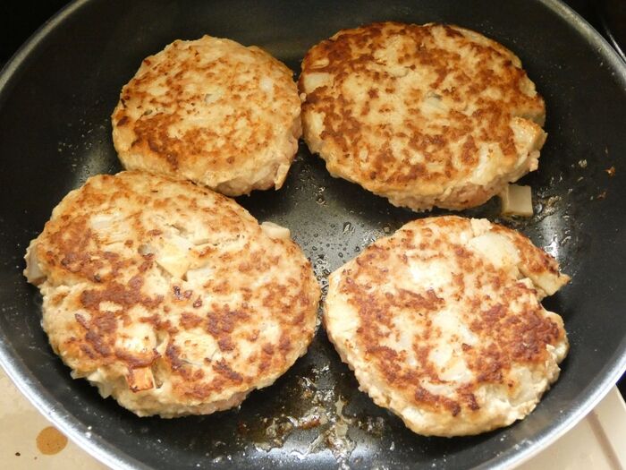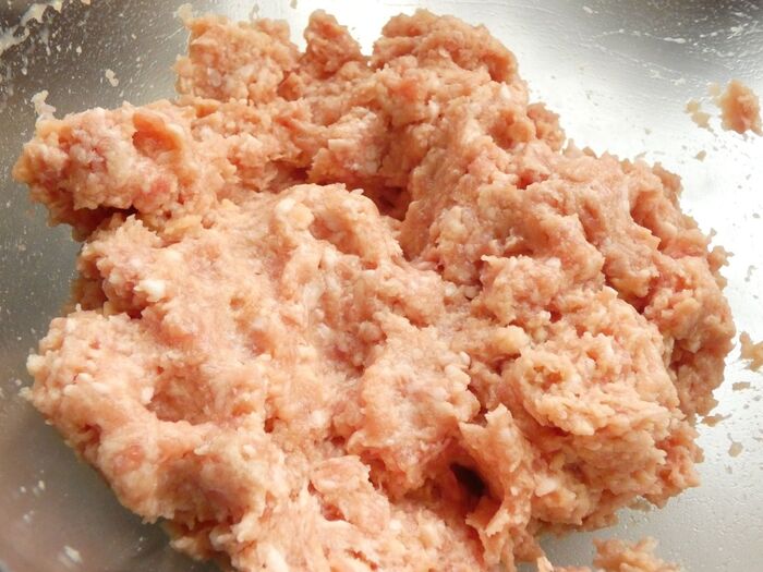 パン粉と牛乳を混ぜ合わせたものと、卵、ひき肉、塩、ブラックペパーをよく混ぜ合わせます。