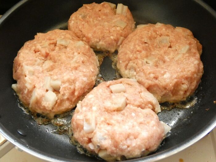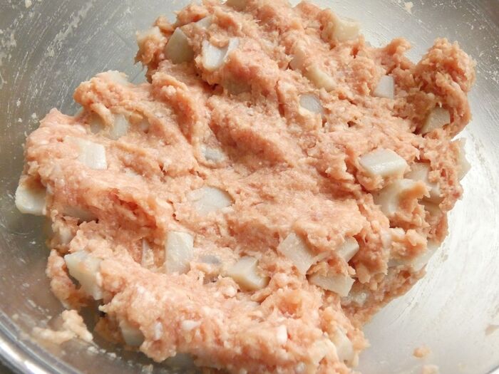 レンコン以外を先にしっかり混ぜ合わせてから、レンコンを合わせると混ぜやすいです。