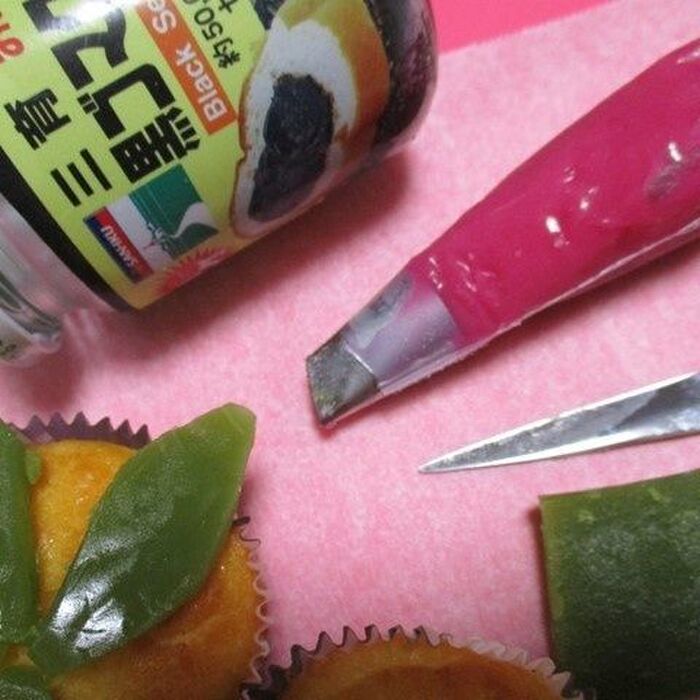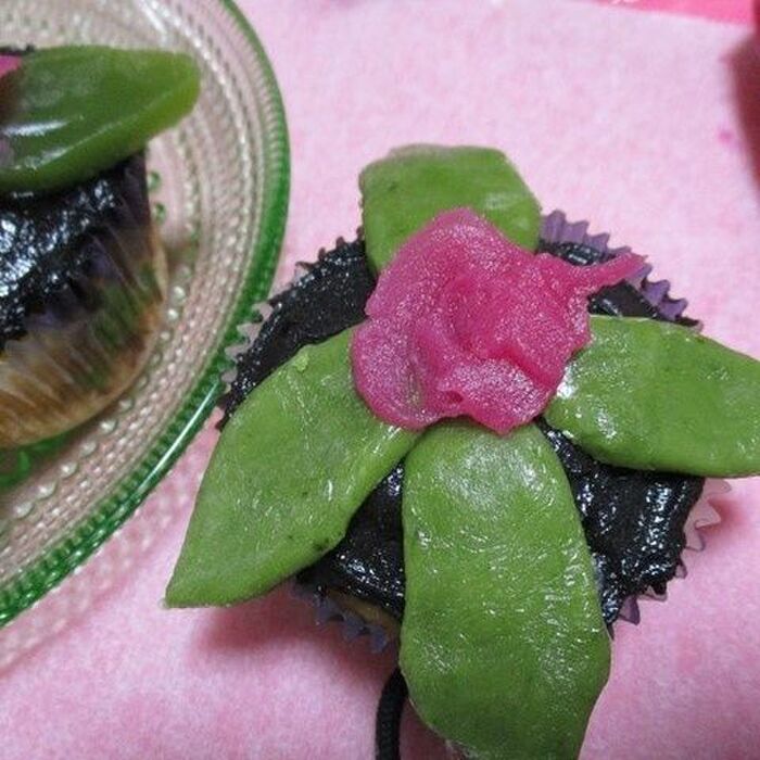 黒ごまクリームを塗ったカップケーキに、日日草の葉っぱを4枚ほどのせて、その中央に、餡を少しのせ、その上に、ピンクの日日草をのせてゆきます、葉っぱは、抹茶餡でもういろうの葉でもお好きなものを4枚選んでください!