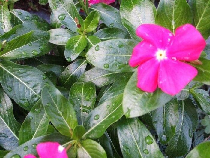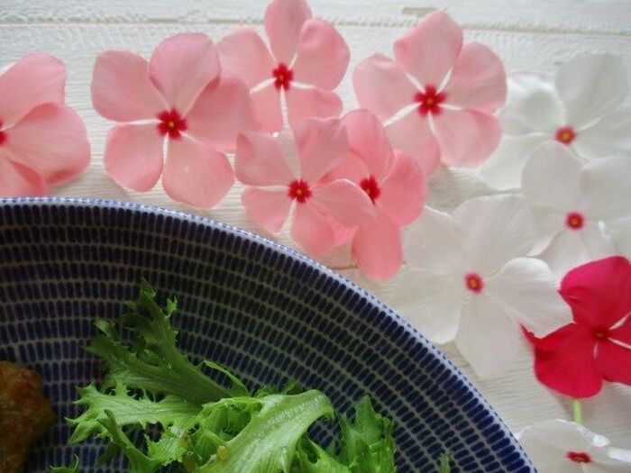 日日草は、ビンカとも呼ばれます、花色は白、ピンク、赤、紫色、オレンジ、のカラーがが基本ですが、花弁の濃淡や、中心部に色がついていたりついてなかったりもして、品種によって、様々です、花の大きさは2~6cmと大小さまざまで、花弁は5枚で構成される一重系が中心ですが、最近は多く花弁が重なる八重系品種などもあります、日日草の葉はとても、大きく、ぶ厚いです