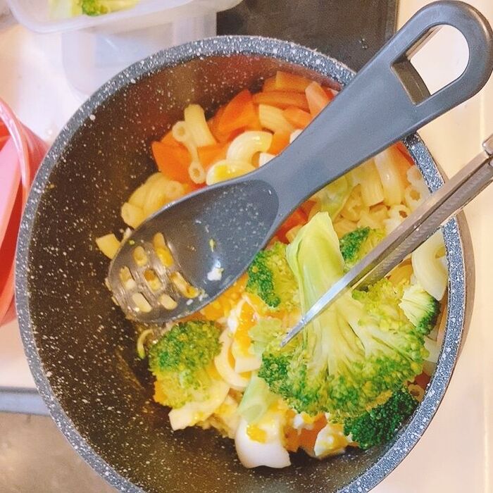 で、茹でたときに使った鍋に他の具材を入れて混ぜれば、ボウルすら不要になります。