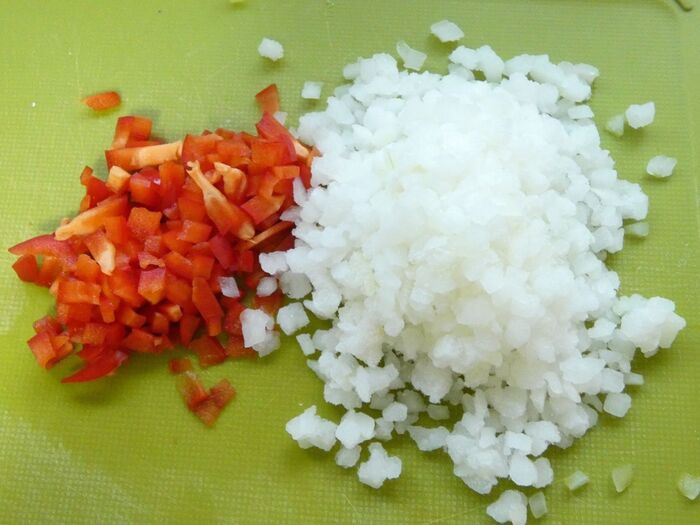 〈具の準備〉玉葱とパプリカはみじん切りにします。