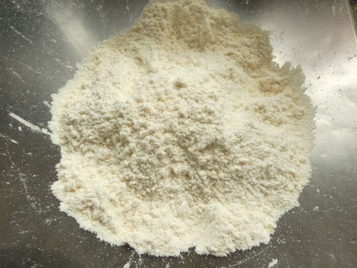 強力粉とよく冷やしたバターを細かく刻んでボウルに入れます。指先でつまむようにして粉とすりあわせ、細かいホロホロ状にします