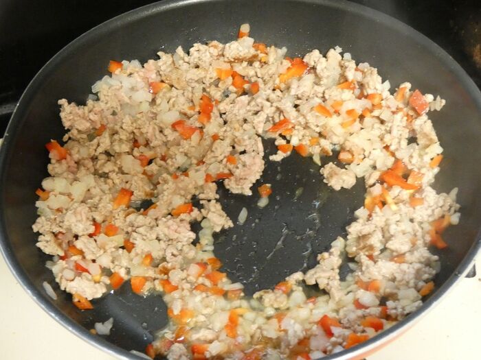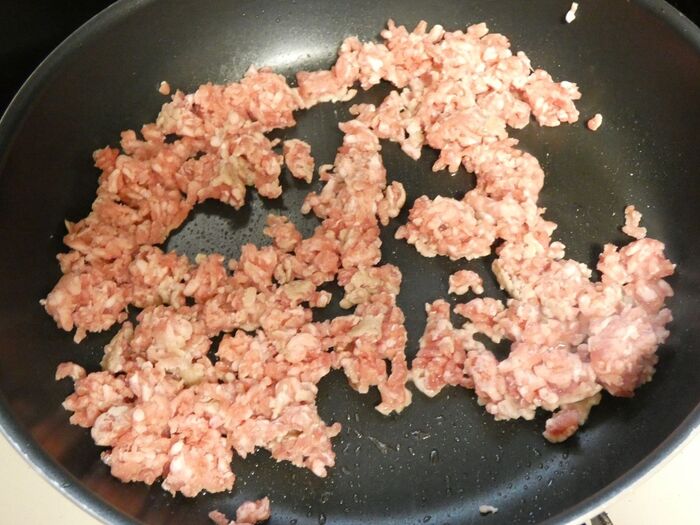 フライパンに油とひき肉を入れて炒め、色が変わってきたらパプリカと玉葱を混ぜ合わせます。