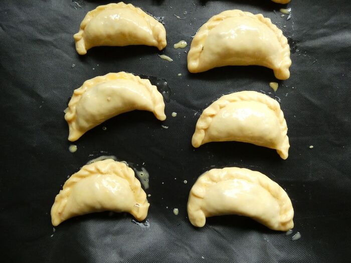 端をねじるようにして止め、天板に乗せて溶き卵を表面に塗ります。オーブン180℃で20分位焼いたら完成♪