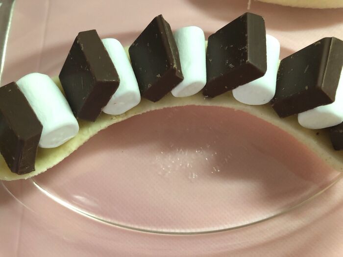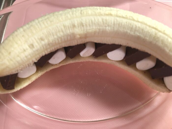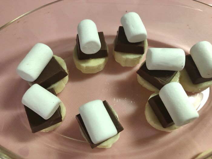 バナナを耐熱皿に乗せ、チョコとマシュマロを交互に並べます。