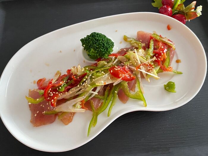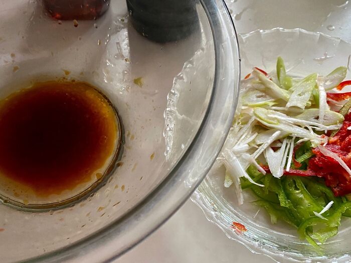 マグロの漬けの上に、ピーマン、長ネギを絡めたものをのせます。