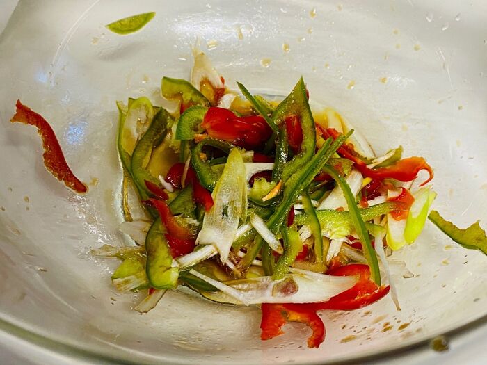 ピーマン、長ネギはスライスしてください。