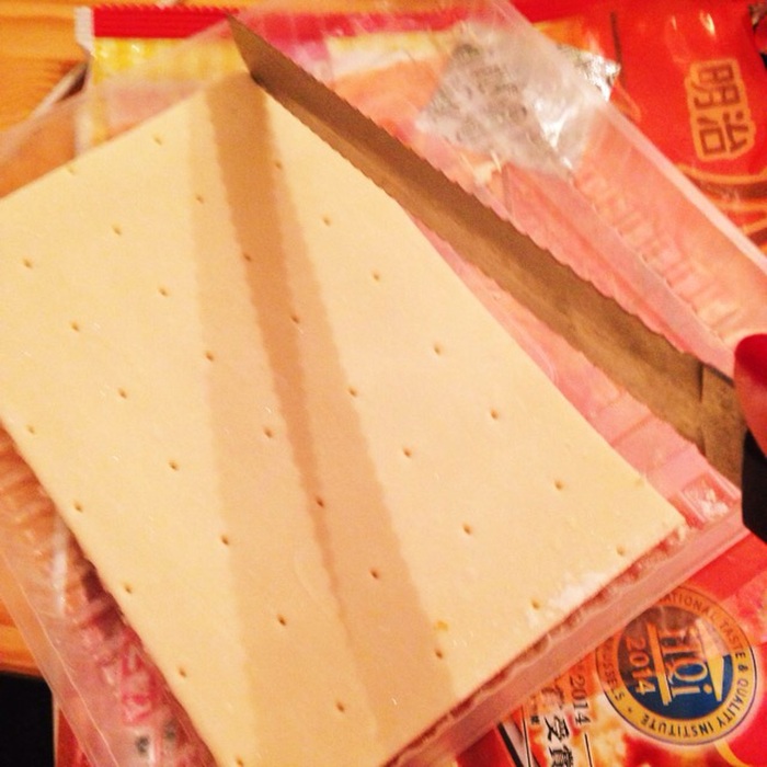 凍らせておいたもう一枚のパイ生地を取り出し、1分くらい置いてから、1㎝弱ほどに切ります。