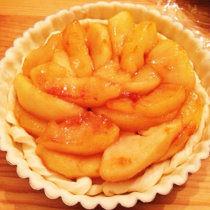 枠にパイ生地を一周分入れ、りんごを並べます。